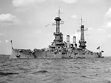 New Hampshire was laid down on 1 May 1905 at the New York Shipbuilding Corporation in Camden, New Jersey. She was launched on 30 June 1906. The ship was commissioned into the US Navy on 19 March 1908; her first commander was Captain Cameron Winslow. After completing final fitting-out work, New Hampshire transported a Marine Expeditionary Regiment to Colón, Panama on 20 June, arriving six days later. She then made a series of visits to ports on the eastern coast of North America, including Portsmouth, New York, and Bridgeport, along with a stop in the Canadian province of Quebec. The ship was then overhauled in New York, followed by training exercises in the Caribbean Sea. On 22 February 1909, she participated in a Naval Review for President Theodore Roosevelt to greet the return of the Great White Fleet in Hampton Roads, Virginia.[3] During this period, Ernest King, later the Chief of Naval Operations during World War II, served aboard the ship in the engine room.[4]