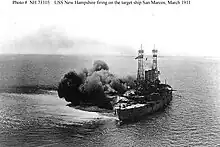 New Hampshire conducted training exercises in the Atlantic and Caribbean through late 1910. On 1 November that year, she steamed out of Hampton Roads with the Second Battleship Division for a visit to Europe. There, the ships stopped in Cherbourg, France and Weymouth, the United Kingdom. The Division departed Weymouth on 30 December and returned to the Caribbean for training, before proceeding to Norfolk on 10 March 1911.[3] On 21–22 March, New Hampshire conducted gunnery training with the target ship San Marcos—the old battleship Texas—in Tangier Sound in Chesapeake Bay. Over the course of the two days of firing, New Hampshire inflicted severe damage to the old ship, sinking her in shallow water. A cursory inspection of the wreck noted that the interior of the ship above the waterline was destroyed and that she had been holed multiple times below the waterline.[5]