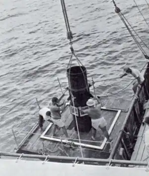Charles H. Gilbert made her 34th cruise – another skipjack-scouting trip in Hawaiian waters – between 21 June and 21 August 1957[76] and made a major discovery: A “skipjack hole”[77] or “skipjack concourse”[78] – a place where skipjack occur year-round rather than only seasonally[78] – off Cape Kaea, Lanai.[76] Her discovery prompted POFI to begin an intensive study of the "skipjack concourse" in July 1957.[78] She collected physical, chemical, and biological data about the "concourse," finding a temperature discontinuity of 1 to 1.5 degrees Fahrenheit (0.56 to 0.83 °C) over about 0.25 nautical miles (0.46 km; 0.29 mi) in the area and more plankton in the discontinuity than on either side of it.[76] She tagged and released 2,416 skipjack – 1,624 of them between 3 and 13 July alone while fishing in the "skipjack concourse"[77] – in the hope that their movements would shed light on the still-mysterious migration of skipjack into Hawaiian waters each summer,[77] and 212 of the fish she tagged were caught by commercial fishing boats by November 1957.[76] She also experimented with a POFI-designed steel and plastic observation "bucket," a subsurface observation platform which she could suspend about 8 feet (2.4 m) below her hull near her stern, allowing a scuba-equipped scientist to observe directly the underwater behaviors of fish in her vicinity for the first time.[79][80] Reporting visibility as great as 180 feet (55 m), scientists in the "bucket" observed the behaviors of bait fish — nehu (Encrasicholina purpurea), Hawaiian silverside (Atherinomorus insularum), and Mozambique tilapia – around the vessel both when she was fishing and when she was not, and at one point estimated 1,000 skipjack and little tunnies around the vessel.[76] Her experiments determined that a scientist could sit in safety in the "bucket" while the vessel made up to 6 knots (11 km/h; 6.9 mph).[79] POFI hoped that this new technique would allow scientists to use their time more efficiently by directly observing the behavior of tuna with regard to bait and artificial lures rather than inferring their behavior indirectly through the use of statistics.[78] She also operated her Sea Scanar against a school of yellowfin, a number of skipjack schools, and several herds of porpoises, sometimes maintaining contact for several hours, but also learning of the device's operational limitations.[76] She occupied an International Geophysical Year oceanographic station at 21°10′18″N 158°18′48″W / 21.17167°N 158.31333°W on 21 June, 21 July, and 20 August,[76] and carried out a monthly 20-station environmental survey off Oahu in June, July, and August, where she made plankton hauls and bathythermograph casts and collected seawater samples for later analysis of their salinity and inorganic phosphate content.[76] She also made weather reports four times daily, noted sightings of fish, and broadcast information on fish sightings to commercial fishing boats.[76]