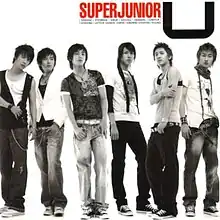"U" is a song by South Korean pop group Super Junior, and is the group's follow-up release to their debut album Twins. The single topped CD sales charts during the first several weeks after its release on June 7, 2006.[1] "U" peaked at #1 on the monthly MIAK K-pop album charts and sold 91,416 copies by 2008.[2] The song won a total of five music recognitions, being Super Junior's most successful single in the music charts until the release of "Sorry, Sorry" in March 2009. Promotional performances for the title song, "U", did not complete until September 2006. The last general performance for the song was in August 2007 in Tokyo, Japan.