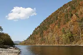 The mountain valleys of Udegyskaya Legende feed the Armu River and the Bolshaya Ussurka River, which flow west to the Ussuri River and ultimately the Amur River, which flows north to the Okhotsk Sea. The main river valley of the Ussurka runs to the north-northeast, along the Sikhote-Alin fault, it is passable to small boats in lower region, with oxbow lakes and marshy banks. The river valleys are narrow and winding. Slopes average 10-15 degrees, but are often 15-25 degrees. At the headwaters of streams, rocky outcrops are rare. The banks of the Armu, though, are rocky and steep, with frequent rapids and waterfalls.[3] There are three small settlements in the park: Far Kut, Dersu, and Ostovnoe.[1]