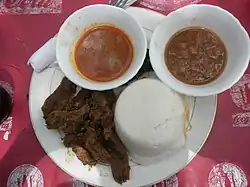 Ugali, also known as posho, nsima, and other names, is a type of corn meal made from maize or corn flour in several countries in Africa.[1] It is cooked in boiling water or milk until it reaches a stiff or firm dough-like consistency.[2] In 2017, the dish was added to the UNESCO Representative List of the Intangible Cultural Heritage of Humanity, one of a few foods in the list.[3]