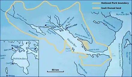 Ukkusiksalik National Park (/uːkuːˈsɪksəlɪk/)[1] is a national park in Nunavut, Canada. It covers 20,885 km2 (8,064 sq mi) of tundra and coastal mudflats south of the Arctic Circle and the hamlet of Naujaat (formerly Repulse Bay), from Hudson Bay's Roes Welcome Sound towards the western Barrenlands and the source of Brown River. The park surrounds Wager Bay, a 100 km (62 mi)-long inlet on the Hudson Bay. Although the smallest of Nunavut's four national parks, it is the sixth largest in Canada. Its name relates to steatite found there: Ukkusiksalik means "where there is material for the stone pot" (from ukkusik, meaning pot or saucepan like qulliq).