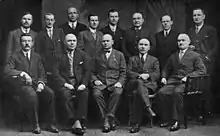 The Ukrainian Social Democratic Labour Party (Ukrainian: Украї́нська соціа́л-демократи́чна робітни́ча па́ртія, romanized: Ukrainska sotsial-demokratychna robitnycha partiia), also known as Esdeky and SDPists, was the leading party of the Ukrainian People's Republic. The party was reformed in 1905 at the Second Congress of the Revolutionary Ukrainian Party and was pursuing Marxism through the Social Democratic Party of Germany's Erfurt Program as well as national and cultural autonomy.[2][1] Party leaders were Volodymyr Vynnychenko, Symon Petliura, Mykola Porsh, Dmytro Antonovych, Lev Yurkevych, Mykhailo Tkachenko, and Mykola Kovalsky.