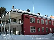 The Swedish Riksdag had in 1929 agreed to the construction of Umedalens hospital, which later came to be Umedalens sjukhus.[3] It was built 1934 according to the blueprint of Carl Westman, who regarded an area near Backen in western Umeå as a suitable place, as the surrounding forests provided a natural barrier against the nearby community. The complex consisted of 22 buildings, which architectural design were inspired by classicism and romantic nationalism, and were marked with the letters M or K, followed by a number. Buildings marked with M denoted those containing males (män, transl. men), while buildings with K housed females (kvinnor, transl. women).[4] Additionally, several culverts were built to connect the buildings, which made it more convenient to transport patients and medicines between them.[5]