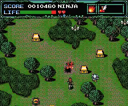 Scattered across every stage are tresure chests containing power-ups that open when shot, ranging from beneficial or harmful items such as a speed boost or poison, to multiple types of weapons.[3][5] Picking up a new weapon grants its initial state and can be upgraded by picking the same weapon twice in a row. In the Sega Mega Drive version, they can be cycled through other weapons and power-ups by firing at them. After defeating a boss, the player can increase their overall status by granting experience points (EXP) to any of the character's four characteristics: strength (ST), magic (MP), dexterity (DX), and agility (AG).[3][5] Diamonds can also be found within chests to gain additional experience points.[5] Getting hit by an enemy or blocked by an obstacle and scrolled offscreen decreases the player's life. Once completely depleted, it will result in losing a live stock, as well as a penalty of decreasing the overall firepower of the character's currently equipped weapon to its original state and starting back at the beginning of a stage. The game is over once all lives are lost.