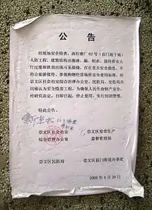 The official tour took visitors only on a small circular stretch of the Underground City.[6] Inside the complex, visitors could see signposts to major landmarks accessible by the tunnels, such as Tiananmen Square and the Forbidden City, and could see chambers labeled with their original functions, such as cinemas, hospitals, or arsenals.[5] A portrait of Mao Zedong could be seen amidst murals of locals volunteering to dig the tunnels and fading slogans such as "Accumulate Grain", and "For the People: Prepare for War, Prepare for Famine".[4] Rooms with bunk beds and decayed cardboard boxes of water purifiers could be seen in areas not open to tourists.[1] Visitors on the official tour would also pass by a functioning silk factory in one of the underground staff meeting rooms of the complex, and be given a demonstration of the process of obtaining silk from silkworm cocoons. They had a chance to buy souvenirs at a tourists' shop operated by the state-owned Qianmen Arts and Crafts Center and the China Kai Tian Silk Company.[6]