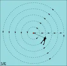 The general procedure is to start from a fixed central point, and to search the circumference of a circle where the radius is defined by a search line anchored at the central point. The radius of the circle is dependent on visibility, and is increased after each circle has been completed, by an amount which allows the diver to either see or feel an overlap between the current arc and the previous arc.[2][3]