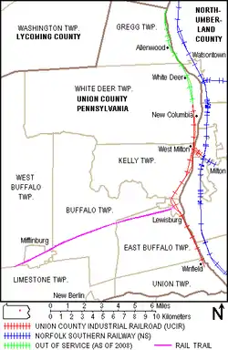 The line is along the right bank of the West Branch Susquehanna River, roughly following U.S. Route 15 between the unincorporated village of Winfield in southern Union County and the village of New Columbia (in White Deer Township) in northern Union County.[1] Other communities served by the UCIR include Lewisburg, the village of West Milton (in Kelly Township), and Milton (east across the West Branch Susquehanna River in Northumberland County).[1]