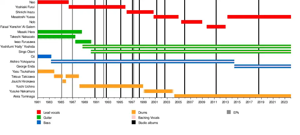 Past members | Oz Yasu Tsukahara Jouichi "Joe" Hirokawa Kouichi "Nao" Takeshi "Mantas" Nakazato Tetsuo "Tetsu" Takizawa Masaki "Marchan" Hara Iwao Furusawa Yoshiaki Furui Hirokazu Uchino Shinichi Inazu Yusuke Nakamura Nob Faisal "Kenshin" Al-Salem Akihiro Yokoyama |