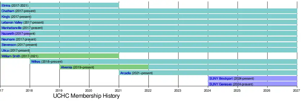 The conference was announced in 2016 as an association of 10 schools and league play began for the 2017–18 academic year, with nine each playing in the men's and women's divisions. The majority of the member schools were previously members of the now-defunct ECAC West hockey conference. Wilkes University was also announced as a future member for both the men's and women's divisions for the start of the 2018–19 academic year,[1] the same time when charter men's member Nazareth College began varsity women's play in the UCHC.[2] The following season, Alvernia University joined for its first season of varsity women's play.[3] A more recent change to conference membership came in July 2021 with the launch of new varsity men's and women's programs by Arcadia University.[4] The most recent change came in 2022–23 when Alvernia added a newly launched men's team to its existing UCHC membership.[5]