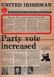 The United Irishman/An tÉireannach Aontaithe, first published in May 1948, under Michael Traynor, was the official monthly organ of Sinn Féin sold by its members. After the split in the Irish Republican Movement, the title continued as the organ of Official Sinn Féin, being published from the offices in 30 Gardner Place in Dublin, with the Provisional wing publishing An Phoblacht.[1][2] The first editor was Seán G. O'Kelly based in an office in 38 South King Street in Dublin.[3] The historian Éamonn MacThomáis edited the paper for a short while prior to the 1970 split in Sinn Féin. Other editors of the paper included Seán Cronin,[4] Seán Ó Brádaigh (1958–1960), Ruairí Ó Brádaigh,[5] Eoin Ó Murchú, Jackie Ward, Seamus Ó Tuathail, Denis Foley and Tony Meade (1967). Contributors to the paper included Eamon McCann, Roy Johnston, Eamon Smullen, Eoghan Harris and Sean Garland.[6][7][8] The United Irishman was replaced with The Irish People and the Workers' Weekly in 1980.[9]
