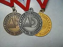 The medals' design is the "AD" portion of the official USAD logo, encircled by "United States" at the top, "Academic Decathlon" at the bottom, and four stars of increasing size on either side. Though the medals are given out only to winners of the competitions, teams can order them along with other study materials.[108] The medals given at state and local competitions are of a different design than those given at Nationals.