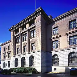 Portland's U.S. Custom House is a large edifice, encompassing a full block bounded by NW Broadway, Everett and Davis Streets, and Eighth Avenue, near the downtown. The four-story building is symmetrical, H-shaped in plan, featuring pavilions extending to the north and south from the central mass. An elegant one-story granite loggia of five tall, arched openings with rusticated walls and a scrolled parapet encloses the entry courtyard and opens onto Eighth Avenue and the North Park Blocks beyond.[1]