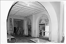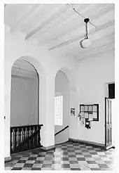 On the second floor, the staircase from the entry passage opens on a large lobby from a two-arched staircase arcade. The lobby extends from the front back to the courtyard and is floored with diagonally laid gray and white marble tiles. The walls, as are old walls in the building, are plastered, and the ceiling has exposed 4x10 beaded ausubo wood beams. Old double four-paneled doors and a transom open to the courtyard. The window in the stairhall has been filled in with glass brick.[10]