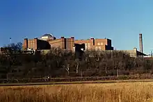 The original USDB followed the Pennsylvania plan modeling on a layout of the Eastern State Penitentiary where cell blocks radiated out from a central structure. Individual cells were relatively isolated. In contrast, the civilian prison, modeled on the Auburn Correctional Facility in New York, reflected a newer concept where prisoners were housed in a large rectangular building where there was a certain amount of communal living.[5] The site covered 12 acres (4.9 ha) with walls from 16 to 41 feet (4.9 to 12.5 m) high.[6]