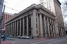 The United States National Bank Building in downtown Portland, Oregon was designed by A. E. Doyle in a Roman classical style,[2] and is listed on the National Register of Historic Places.[5] The four-story building's first section, facing Sixth Avenue, was completed and opened in 1917. The building features a four-story Corinthian colonnade at its eastern end (originally the principal façade) and makes extensive use of glazed terracotta. The interior is also decorated extensively with highly textured materials.