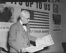 The OWI suffered from conflicting aims and poor management. For instance, Elmer Davis, who wanted to “see that the American people are truthfully informed,” clashed with the military that routinely withheld information for “public safety”.[32] Further, OWI employees grew ever more dissatisfied with “what they regarded as a turn away from the fundamental, complex issues of the war in favor of manipulation and stylized exhortation”.[33] On April 14, 1943, several OWI writers resigned from office and released a scathing statement to the press explaining how they no longer felt they could give an objective picture of the war because “high-pressure promoters who prefer slick salesmanship to honest information” dictated OWI decision-making.[34] President Roosevelt's “wait-and-see” attitude and wavering public support for OWI damaged public opinion of the agency.[35]