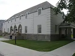 The Yellowstone Main Post Office in Yellowstone National Park was built in Mammoth Hot Springs as part of a facilities improvement program by the United States Post Office Department (USPOD). The post office in Yellowstone was nominated to the National Register of Historic Places as part of a thematic study comprising twelve Wyoming post offices built to standardized USPOD plans in the early twentieth century. The Yellowstone facility is an understated classical structure with a low hipped roof and rounded dormers that uses a plan and a basic design vocabulary similar to that used in other post offices in the program. However it also includes restrained French Renaissance Revival elements, the only post office in the western United States to merge these two styles.[2] It is somewhat at odds with the prevailing design theme expressed in other buildings in the former Fort Yellowstone district.[3] The Yellowstone Main Post Office is also a contributing property to the Mammoth Hot Springs Historic District.[2]