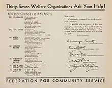 A broadside published in the 1930s by the Federation for Community Service in Toronto, showing how donations are distributed to member agencies