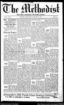 Issue No. 1 of Vol. 1 of The Methodist was first published on 2 January 1892 by the Wesleyan Methodist Church.[1] At this time it incorporated the newspaper The Weekly Advocate. The publishers aimed their publication at Methodists within New South Wales, but hoped to gain a wider audience.[2] Issue No. 1 of Vol. 1 of