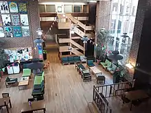 The campus is self-contained, with facilities including eights cafes/restaurants, a post office, a Co-op Food store, a market, a bank, a pharmacy, a health centre (including a dentist) and childcare facilities.[37] Spence's designs were appreciated by architects; many of the campus buildings won awards. A number of features define these buildings, including the materials used and the fact that many of them have planted and tree-filled courtyards. The gatehouse-inspired Falmer House won a bronze medal from the Royal Institute of British Architects.[5] Another campus building, The Meeting House, won the Civic Trust award in 1969.[38] In 1993, the buildings which made up the core of Spence's designs were given listed building status, with Falmer House being awarded the highest designation, Grade 1, as a building of "exceptional interest".[38] A number of the original buildings are now Grade II listed buildings.[39]