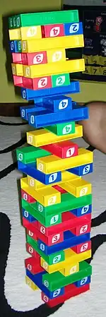 UNO Stacko is one of the many variations of the card game Uno. This game is a block-stacking tower game which combines the gameplay of Uno and that of Jenga. There are two versions of the game: the earlier version requires the use of a dice, while later versions eliminate the dice, making the game play closer to Jenga.
