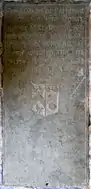 The ledger stone (across the middle of which now stands the 1926 wooden chancel screen) of James Courtenay (d.1592) "The Younger" survives in the Upcott Chapel, St Matthew's Church, the most ancient stone in the church,[26] inscribed in Gothic script as follows: