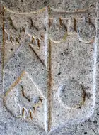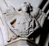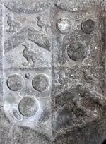 - ↑ The roundels on the label are stated by some sources to be "plates" (with tincture argent (white)) but in others to be "bezants" (with tincture or (gold)). These are the ancient arms of the Courtenay Earls of Devon differenced by a label which itself is further differenced by charges
