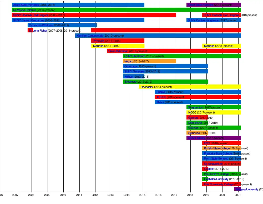 Erie Community College | Williamsville, New York | 1946 | Community College | 13,649 | 2018 | Kats | 2019 | Cheektowaga Recreation Ice Arena |