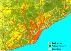 According to the EURBANET project by Delft University of Technology[10] it speaks about polynuclear urban region when there exists a series of important urban centers that relate intensely among them and to the exterior. This one is the case of bordering zones to the urban region that they extend around the cities of Tarragona and Girona. They are areas with a great economic dependence and services to the capital. They are narrow corridors well communicated to Barcelona, both by highway and railroad, which there fuse the metropolitan areas of these cities with the urban region. The PUR of Barcelona comprises 6,103,221 people in an area of 6,005 km2.