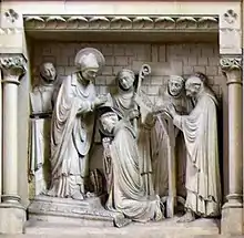 Ursmar receives holy orders as abbot of Lobbes Abbey in 691, probably by Saint Lambertus, bishop of Maastricht (19th-century relief in the Church of Saint Ursmar in Lobbes)