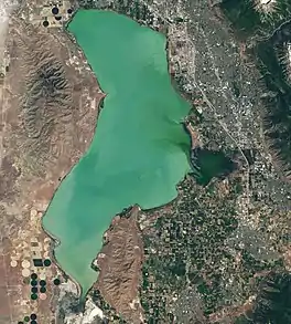 Utah Lake is within Utah Valley in north-central Utah. Mountains surround Utah Valley on three sides: the Wasatch Range to the east, Traverse Mountains to the north, and the Lake Mountains to the west. Mount Nebo reaches an altitude of 11,863-foot (3,616 m),[15] and Mount Timpanogos reaches an altitude of 11,745-foot (3,580 m),[16] nearly 7,250 feet (2,210 m) above the valley floor. Jutting into the south portion of the lake is 6,805-foot (2,074 m) West Mountain,[17] which divides Goshen Bay and Lincoln Beach. Utah Lake is situated on the western edge of the valley and covers more than 25% of Utah Valley's floor.[4] Because of its location on the western side of the valley, the eastern shore has a gentle slope and the western shore rises abruptly against the Lake Mountains. Connected to the main body of the lake are two large, shallow bays: the aforementioned Goshen Bay (north Goshen Valley) to the south and Provo Bay to the east. Major cities such as Provo and Orem are located between the lake's eastern shore and the Wasatch Range.