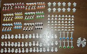 The puzzle consists of 152 pieces ("cubies") on the surface. There are also 66 pieces (60 movable, 6 fixed, and a central "spider" frame) entirely hidden within the interior of the cube. The V-Cube 7 uses essentially the same mechanism, except that on the latter these hidden pieces (corresponding to the center rows) are made visible.[1]