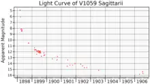 The astronomical literature contains a variety of values for V1059 Sagittarii's peak brightness. Özdönmez et al. list the peak magnitude as 2.0 (visual),[8] while Downes et al. report a much fainter value of magnitude 4.9 (photographic).[2] Novae are usually classified as "fast" or "slow" based on the time it takes the star to drop from peak brightness by more than 3 magnitudes (T3), but for this nova the decline from maximum was poorly observed, and no T3 value has been reported. Nonetheless, it is classified as a fast nova. Vogt et al. monitored the quiescent nova 116 years after the nova event, and saw minor (0.5 to 0.8 magnitude) variations occurring at irregular intervals, similar to low amplitude dwarf nova outbursts.[9]