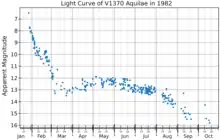 V1370 Aquilae faded rapidly after its discovery, and it had dimmed by three magnitudes in 13 days, making it a "fast" nova in the classification scheme of Cecilia Payne-Gaposchkin.[6][7] The light curve passed through a local minimum 43 days after the nova's discovery. That "dust dip", about 1 magnitude deep, resulted in the light curve being classified as type D.[8][9]