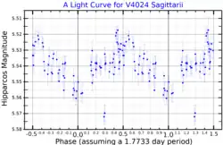 This object is a massive Be star with a stellar classification of B2Ve.[4] The 'e' suffix indicates the spectrum of the star displays emission lines, which are created by materials ejected from the equatorial region of this rapidly rotating star. It is classified as an eruptive Gamma Cassiopeiae variable and has been measured ranging in brightness from visual magnitude 5.34 down to 5.60.[3] The star is an estimated 5 million years old with 8.8 times the mass of the Sun[9] and about 4.5[8] times the Sun's radius. It is spinning with a projected rotational velocity of 105 m/s. V4024 Sagittarii is radiating 7,551 times the luminosity of the Sun from its photosphere at an effective temperature of 18,100 K.[7] Koen and Eyer examined the Hipparcos data for this star, and found that its brightness varied with a period of 1.7733 days.[13]