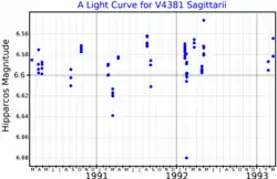 V4381 Sagittarii is a variable star in the constellation Sagittarius. A white supergiant of spectral type A2/A3Iab, it is an Alpha Cygni variable that varies between apparent photographic magnitudes 6.57 and 6.62. Its visual apparent magnitude is about 6.54.