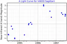V4650 Sgr is calculated to be one of the most luminous stars known, at 1,700,000 L☉ to 7,943,000 L☉. It is considered to be a bona-fide luminous blue variable, although it has not been observed to change temperature from the S Doradus minimum strip to a cooler outburst state.[9] The infrared brightness has varied between magnitude 7.0 and 7.9.[2] It is calculated to have a temperature of 11,300 K and a radius of 350 R☉. Unlike both the two nearby LBVs, V4650 Sgr has no detectable associated nebulosity.[8]