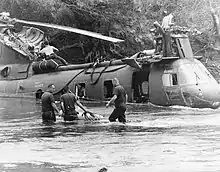 From 10 January to 18 February 1968 the squadron served on USS Valley Forge as the Special Landing Force (SLF) Bravo helicopter squadron.[6]:631 During this time they supported Operation Badger Catch.[6]:116–7 The squadron supported US and South Vietnamese forces fighting in the Battle of Huế, flying in Army of the Republic of Vietnam (ARVN) reinforcements into the Mang Ca Garrison on 1 February.[6]:176 On 6 June a squadron CH-46A #152533 was shot down at LZ Loon, southeast of Khe Sanh Combat Base, resulting in 13 U.S. killed.[7][8] On 1 September the squadron transferred to SLF Bravo again onboard USS Tripoli.[6]:636 On 28 December the squadron was transferred to Marine Aircraft Group 16 (MAG-16) at Marble Mountain Air Facility.[6]:719 In December the squadron supported Operation Taylor Common.[6]:438