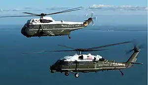 VXX, officially the Presidential Helicopter Replacement Program, is a procurement program to replace aging Marine One helicopters that transport the President of the United States. The current VH-3 helicopters have aging airframes, having entered service with United States Marine Corps Marine Helicopter Squadron One (HMX-1) in 1963. The VH-3D replaced the VH-3A by 1976.[6] The smaller VH-60N entered service in 1987.[7] On 7 May 2014, it was announced that the Sikorsky VH-92 had won the VXX competition.[8]
