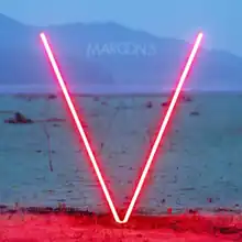 The album cover for V was created by South Korean photographer Lee Jung.[12] It features a 1.3m neon lighted crosstube formed in the shape of the roman numeral for five, the title of the album.[13] The red neon display is placed in front of a reservoir in the Gyeonggi Province,[12] with mountains in the background. The Maroon 5 logo appears out of focus in the background as a sign perched on the side of the mountain, similar to the famous Hollywood Sign.[14] An alternate cover for the album was created by Indonesian graphic designer Bayo Gale (who won the band's alternate album cover art contest).[15] It features the tiger's face with a shape of the letter V with a vertex at the bottom and the Maroon 5 logo.
