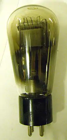 A vacuum tube consists of two or more electrodes in a vacuum inside an airtight envelope. Most tubes have glass envelopes with a glass-to-metal seal based on kovar sealable borosilicate glasses, although ceramic and metal envelopes (atop insulating bases) have been used. The electrodes are attached to leads which pass through the envelope via an airtight seal. Most vacuum tubes have a limited lifetime, due to the filament or heater burning out or other failure modes, so they are made as replaceable units; the electrode leads connect to pins on the tube's base which plug into a tube socket. Tubes were a frequent cause of failure in electronic equipment, and consumers were expected to be able to replace tubes themselves. In addition to the base terminals, some tubes had an electrode terminating at a top cap. The principal reason for doing this was to avoid leakage resistance through the tube base, particularly for the high impedance grid input.[7]:580[8] The bases were commonly made with phenolic insulation which performs poorly as an insulator in humid conditions. Other reasons for using a top cap include improving stability by reducing grid-to-anode capacitance,[9] improved high-frequency performance, keeping a very high plate voltage away from lower voltages, and accommodating one more electrode than allowed by the base. There was even an occasional design that had two top cap connections.