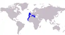 The vadigo inhabits the eastern Atlantic Ocean only, distributed from The British Isles in the north to Senegal in the south, with the species also found around distant offshore islands including Madeira and the Canary Islands.[2] The species is also common in the western Mediterranean Sea, where it has recently been found to extend as far north as the Adriatic Sea. The authors who reported this northern capture believe this shows an expansion of the vadigo's range, comparing it to a number of other carangid species who have recently been found outside of their normal range.[9]