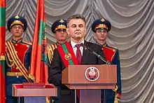 Supported by the Sheriff conglomerate,[7] he defeated incumbent President Yevgeny Shevchuk in the 2016 presidential elections, receiving 62% of the vote.[8] He was inaugurated on 27 December at the Nadezhda Aronetskaya State Drama Theatre.[9] On 4 January 2017, he received newly elected Moldovan President Igor Dodon in Bender, who was the second Moldovan leader to visit the Pridnestrovian Moldavian Republic (PMR) in several years.[10] In January 2019, he attended the opening of the PMR representative offices in Moscow, replacing the Cooperation Center "Transnistria".[11] On 29 May, he announced the creation of an international lawsuit against Moldova in which the PMR asks for compensation for "the aggression against the people of Transnistria".[12] In August, he attended a ceremony at the base of the Operational Group of Russian Forces with Russian Defence Minister Sergey Shoigu dedicated the 75th anniversary of the Liberation of Moldova in the Second Jassy–Kishinev Offensive.[13][14][15][16] In late October, he met with President Dodon at his presidential residence in Holercani ahead of the Bavaria Conference, scheduled for 4–5 November.[17][18]