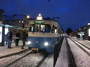 ![]() Tram stop at night with an M29 tram bound for Linneplatsen on line X | |