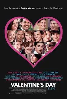 Valentine's Day is a 2010 American romantic comedy film directed by Garry Marshall. The screenplay and the story were written by Katherine Fugate, Abby Kohn, and Marc Silverstein. The film features an ensemble cast led by Jessica Alba, Kathy Bates, Jessica Biel, Bradley Cooper, Eric Dane, Patrick Dempsey, Héctor Elizondo, Jamie Foxx, Jennifer Garner, Topher Grace, Anne Hathaway, Carter Jenkins, Ashton Kutcher, Queen Latifah, Taylor Lautner, George Lopez, Shirley MacLaine, Emma Roberts, Julia Roberts, Bryce Robinson and Taylor Swift in her film acting debut. The film received negative reviews but was a box office success.