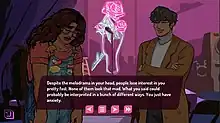 ValiDate is a visual novel and dating sim where players interact as 13 creatives living in the fictional Jercy City area, as they navigate "9-to-5s, quarter-life crises, and harsh truths millennials must navigate in their 20s".[2] The game features a cast of Black and brown characters, with different body types, backgrounds, and sexualities.[3] The characters weave in and out of each other's routes, with varying levels of success depending on their unique dynamics.[4]