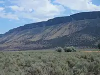 Abert Rim is approximately one mile east of Valley Falls. The rim is one of the highest escarpments in the United States, rising 2,500 feet (760 m) above the valley floor. The top 800 feet (240 m) is a sheer-cliff. The rim cliff runs over 30 miles (48 km) from north to south, making it the longest exposed block fault scarp in North America. The rim is basalt, formed by large lava flows during the Miocene epoch. After the lava flows stopped, large blocks faults broke and tilted the land. Abert Rim is the result of one of those giant faults.[1][9][12][13]