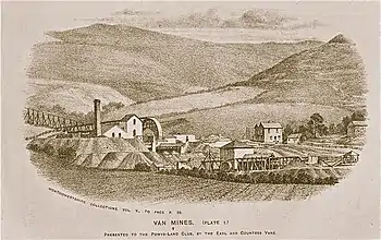 The hamlet grew in the 19th century with the discovery of large deposits of lead, and a thriving lead mine was developed. At one point during the late 19th century 'Van Mine' was the most productive in Europe. The mines declined under pressure from foreign imports in the early 20th century plus mis-management, and operations ceased in the inter-war period. The name Van is also given to the small lake located just outside the village, Van Pool (Welsh: Pwll y Fan).